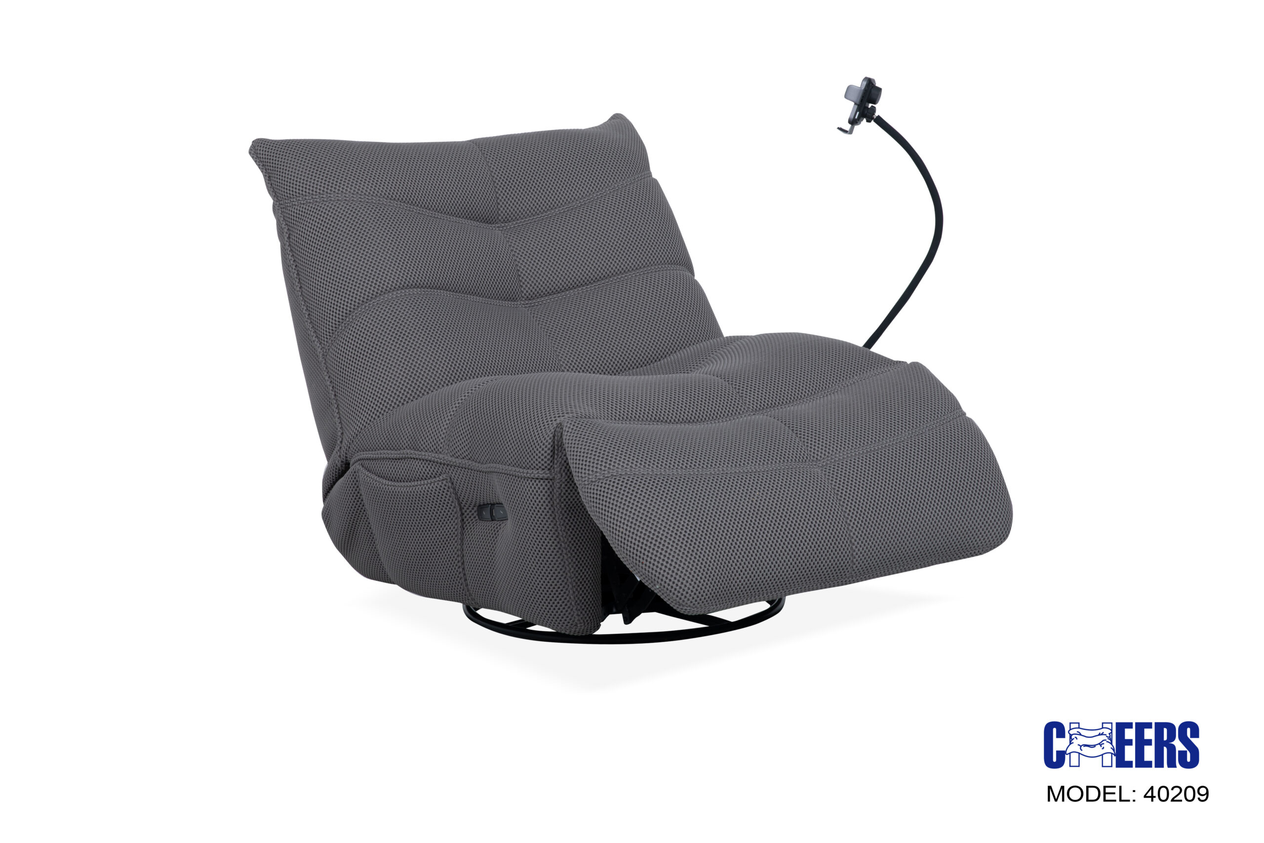 Siva relax fotelja sa mehanizmom okretanja, ljuljanja i električnog napajanja.