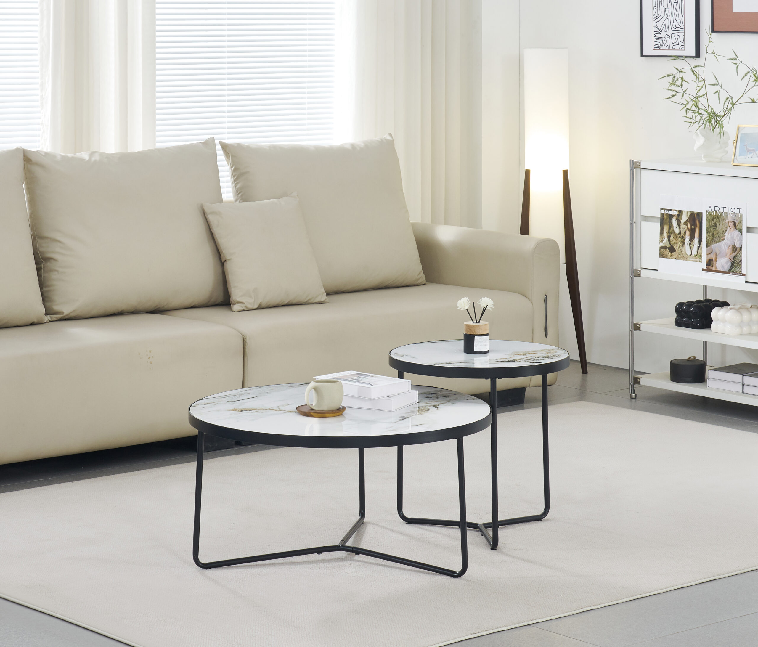 Set se sastoji od dva stola različitih dimenzija koji se mogu koristiti zajedno ili odvojeno. Manji stol se jednostavno uvlači ispod većeg, čime se štedi prostor i omogućava prilagodba prema potrebi – bilo da vam treba više površine za odlaganje ili želite minimalistički raspored.
