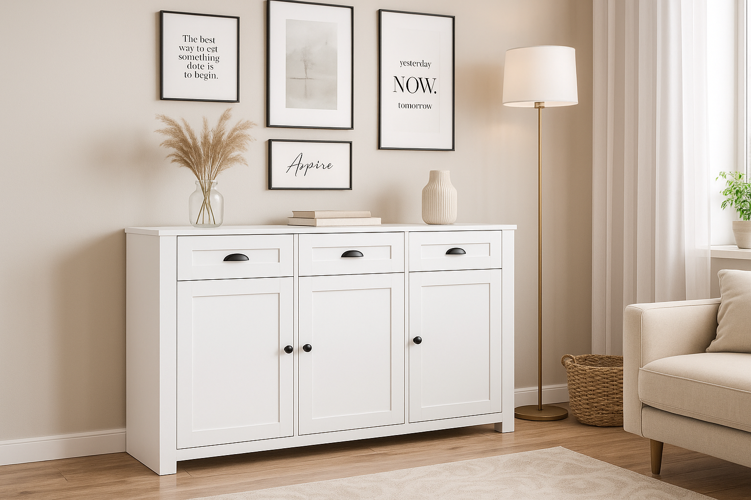 Komoda MONE E savršen je spoj funkcionalnosti i bezvremenskog dizajna. Bijela mat površina, crne ručkice i čiste linije stvaraju dojam profinjenosti koji se lako uklapa u svaki interijer.