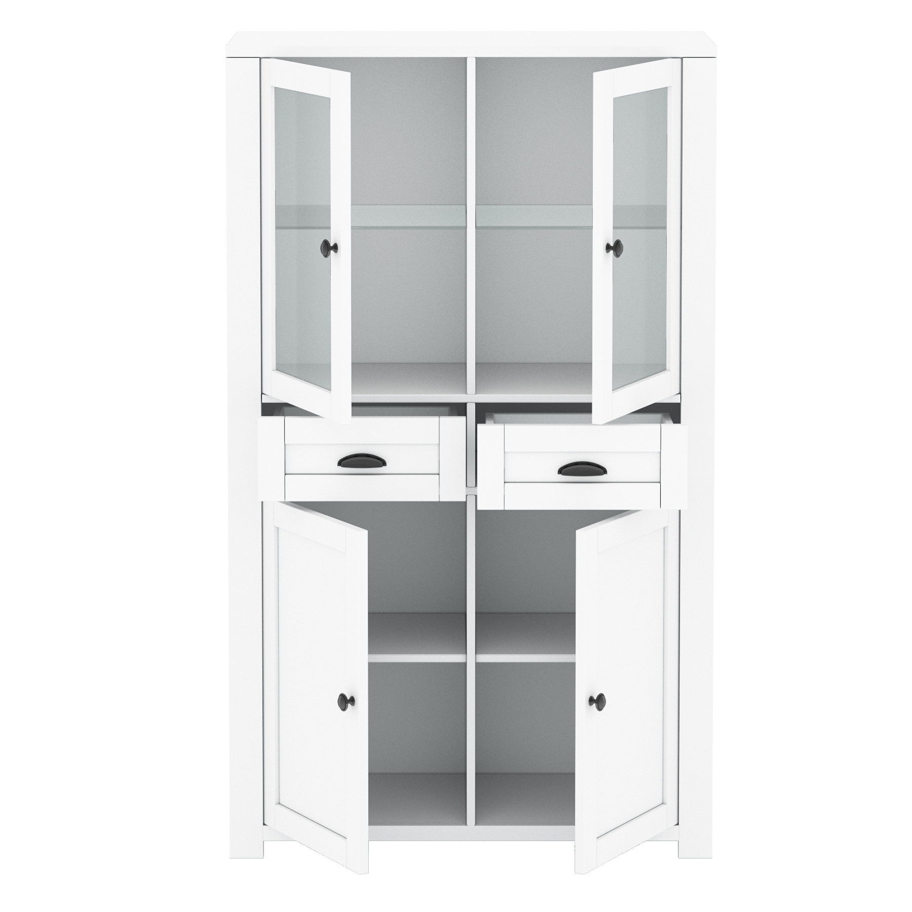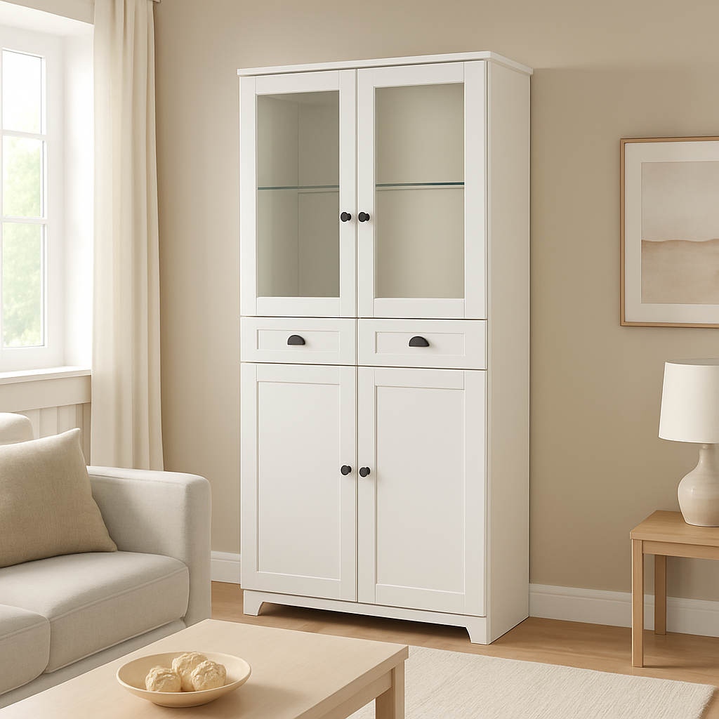 Vitrina MONE C donosi savršenu kombinaciju stila i praktičnosti u vaš dnevni boravak. Klasičan dizajn s bijelom mat površinom, staklenim vratima i diskretnim crnim ručkicama čini je idealnim izborom za sve koji vole jednostavnost i eleganciju.