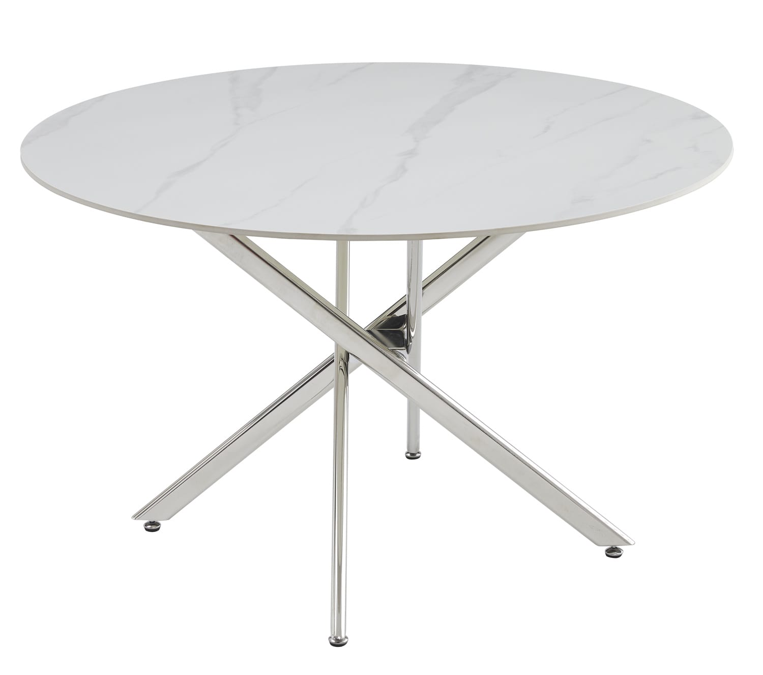 Elegantno postolje u krom završnici dodatno naglašava savremeni stil stola, pružajući stabilnost i sofisticiran izgled koji se lako uklapa uz različite modele trpezarijskih stolica.