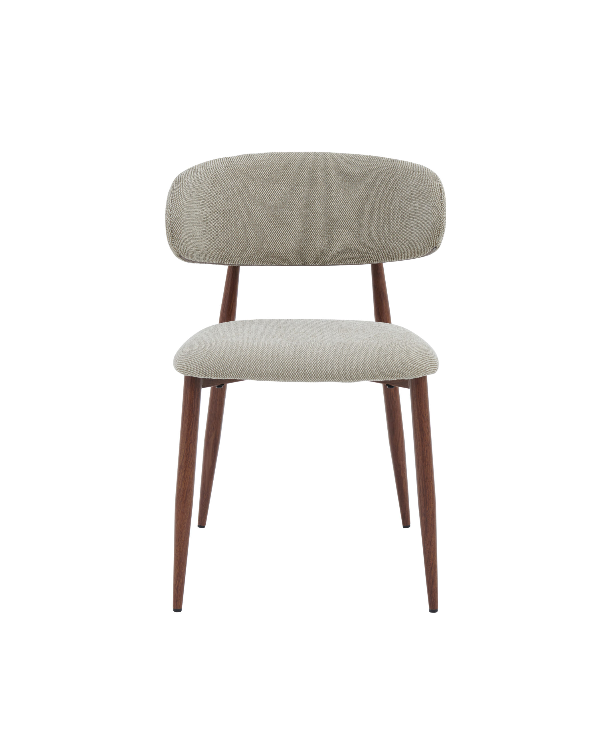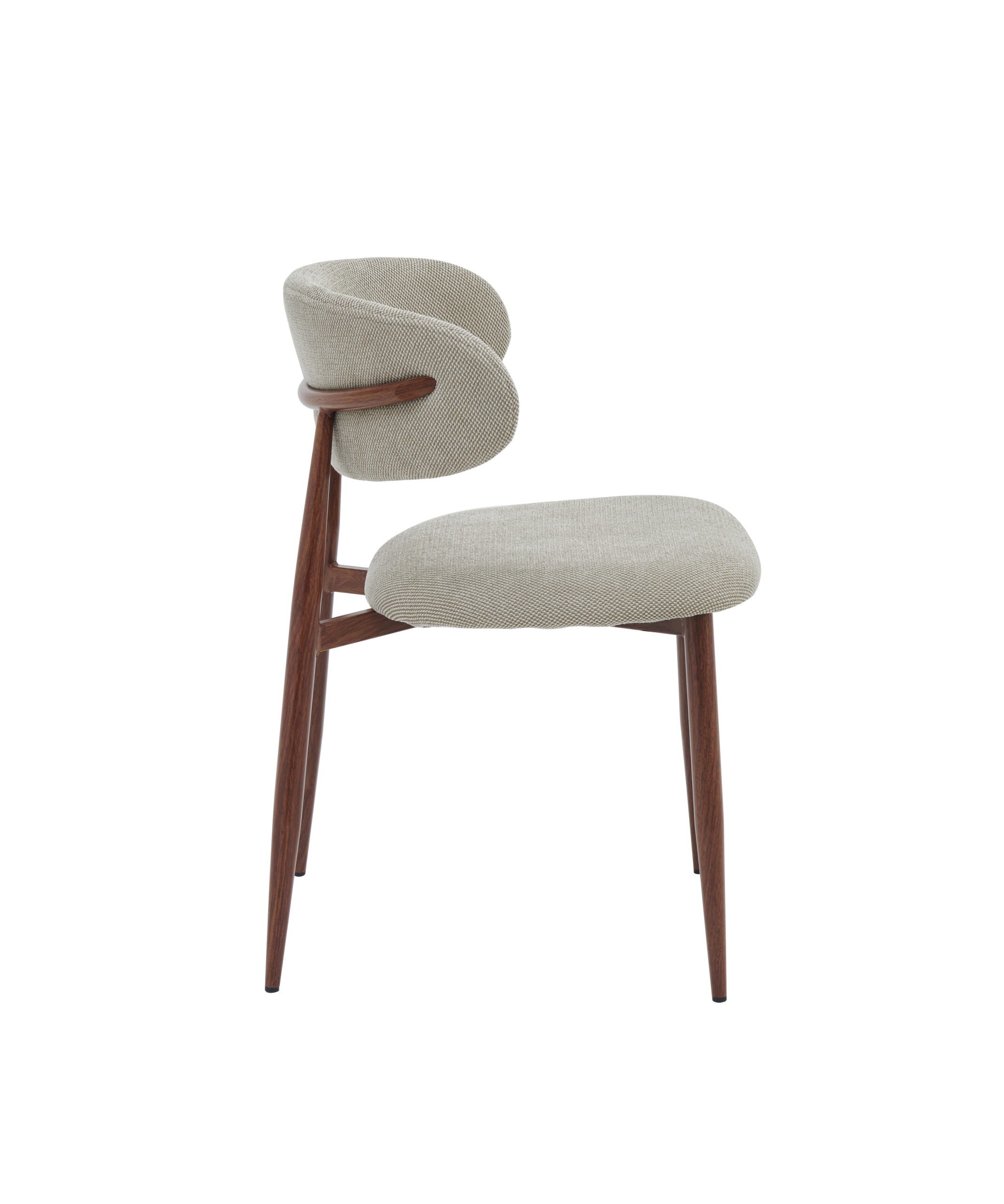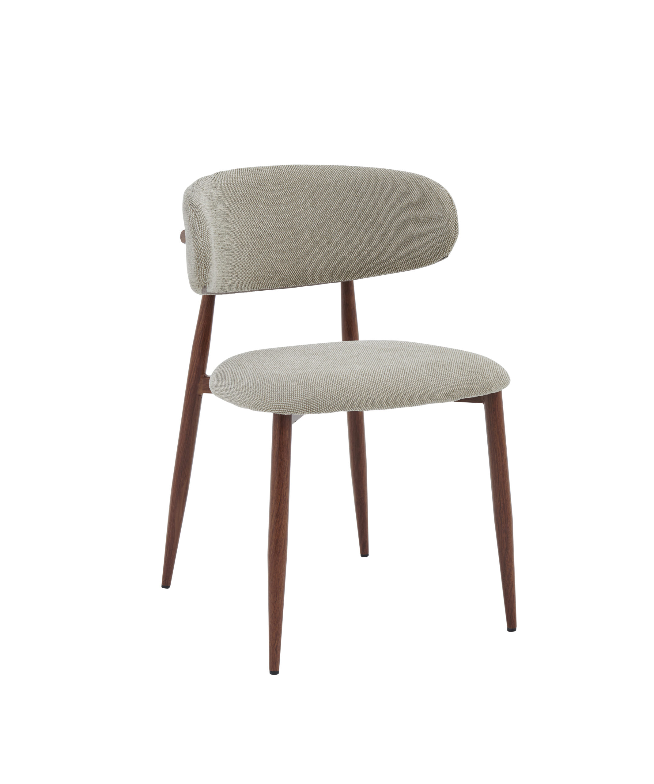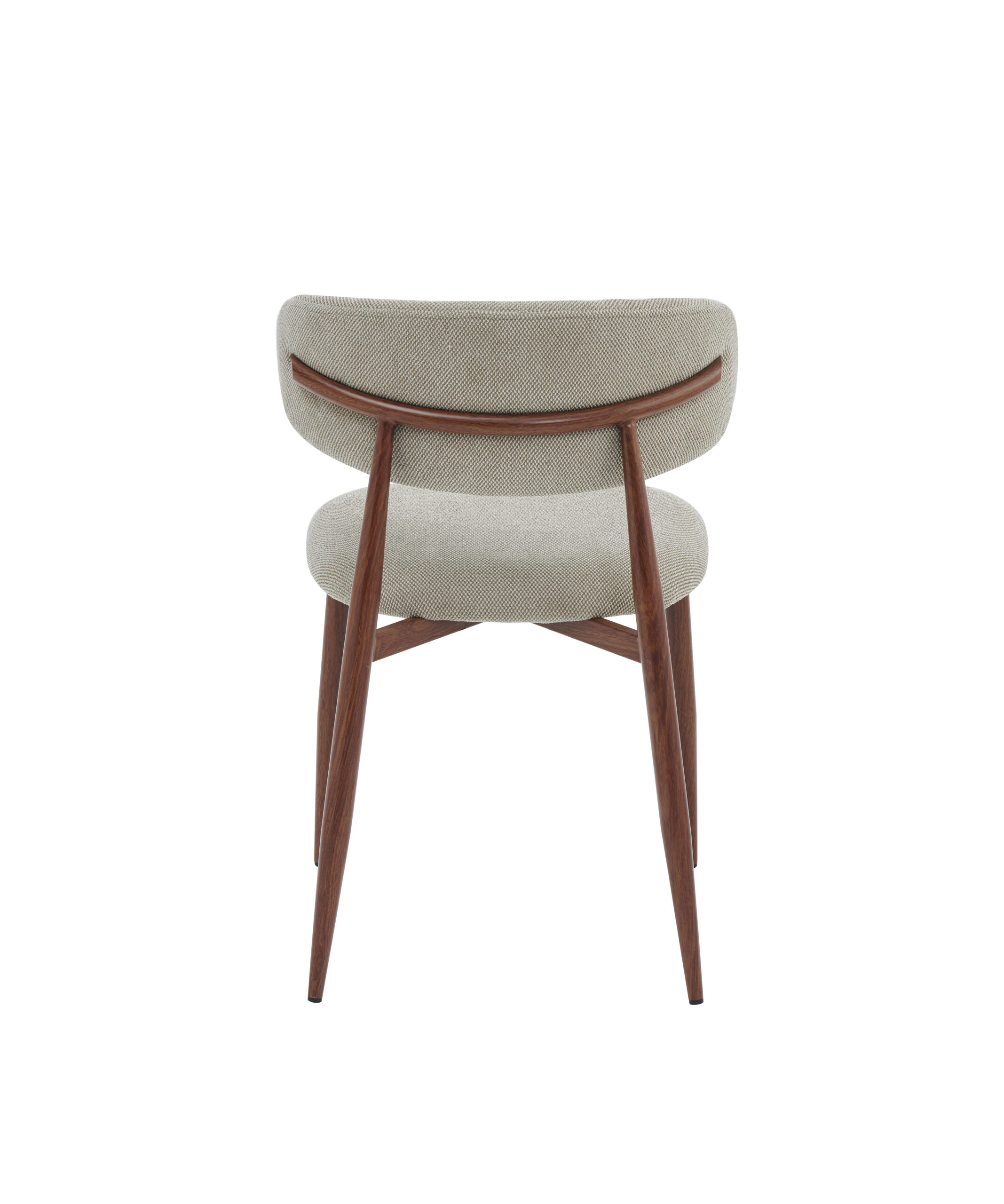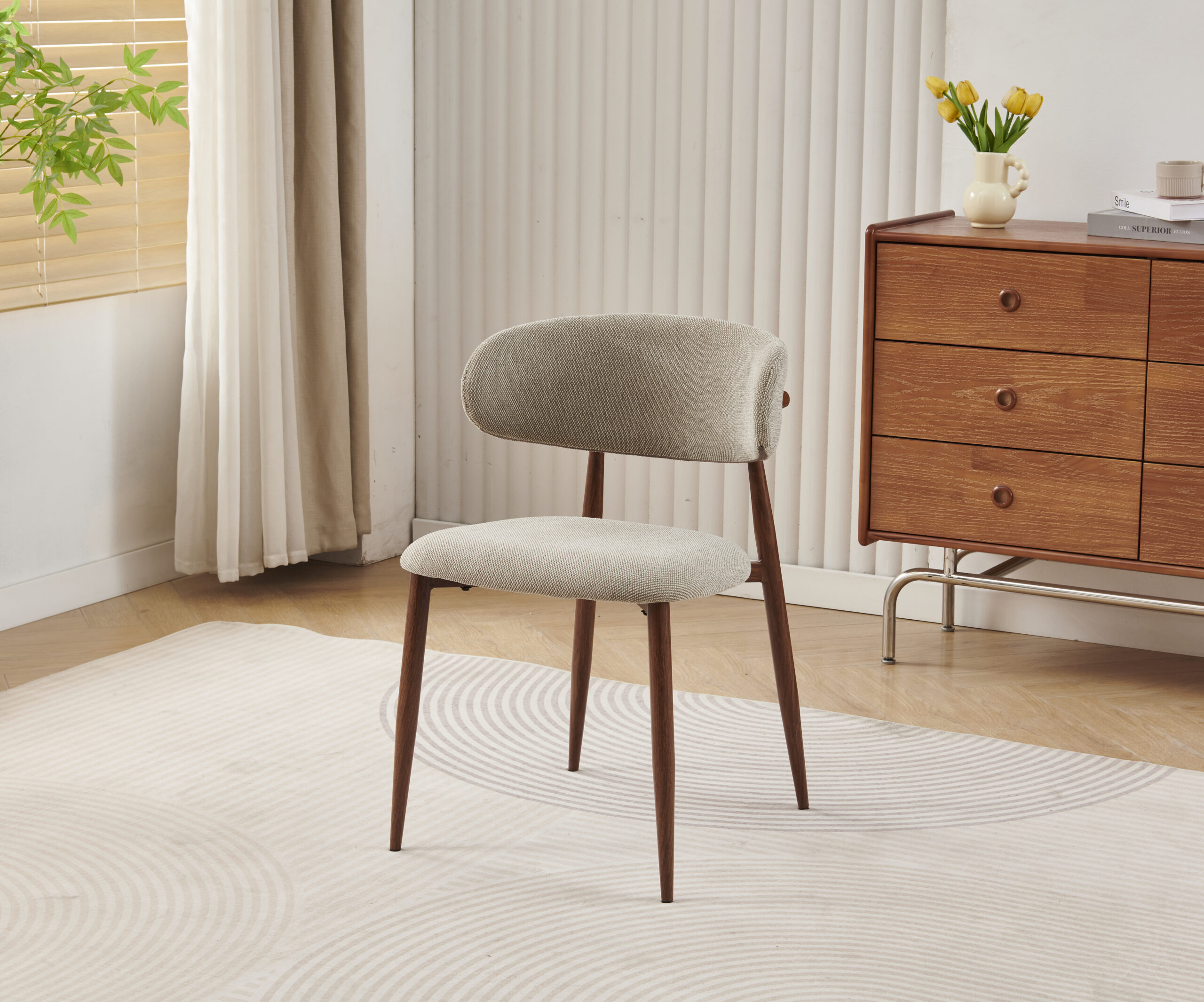 Sjedište i naslon presvučeni su kvalitetnim štofom u bež boji, koji pruža izuzetnu udobnost i ugodan osjećaj pri sjedenju. Blago zaobljen naslon ergonomski prati liniju leđa, čime omogućava pravilno držanje i dodatni komfor čak i tokom dužeg boravka za stolom.