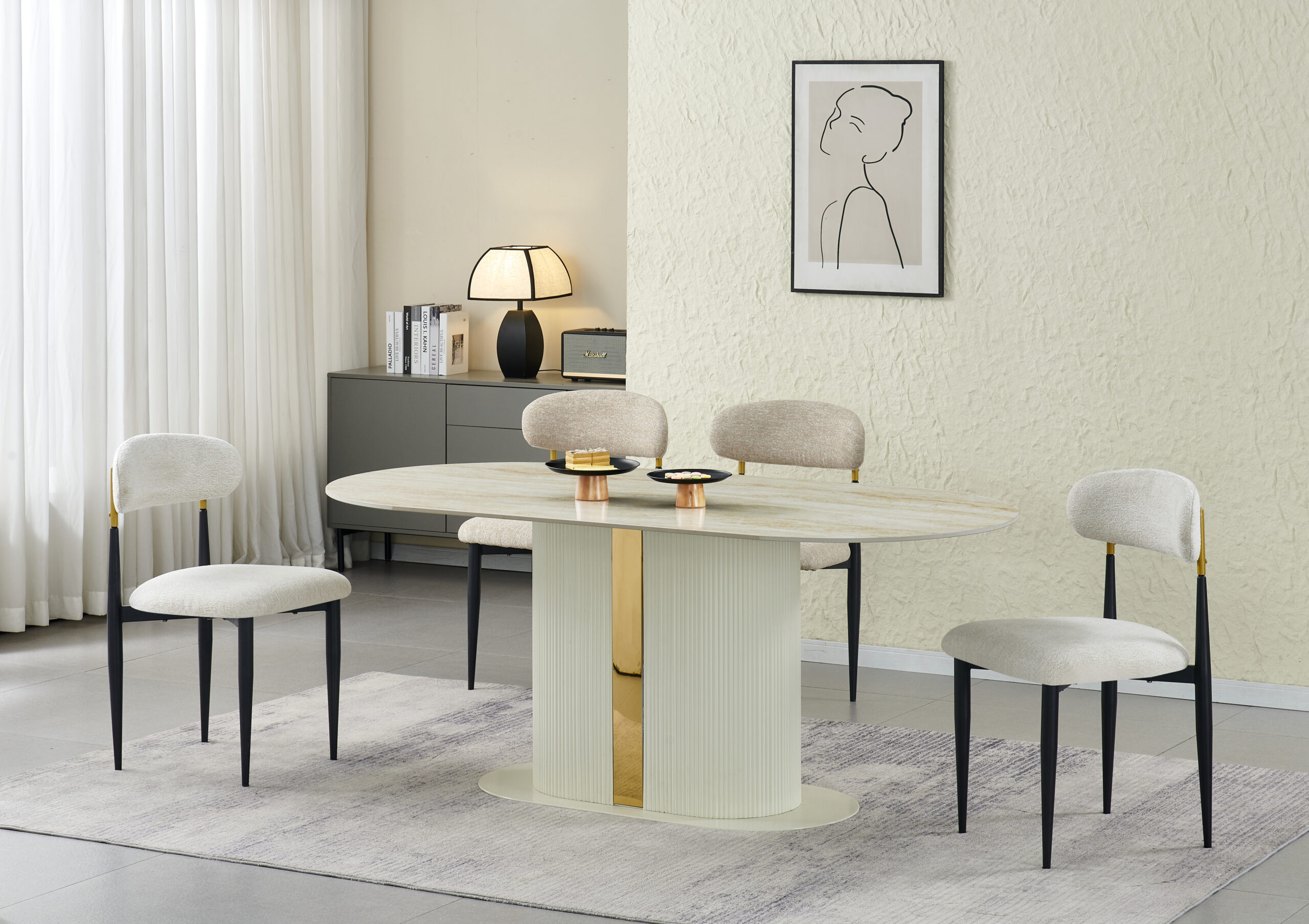 Ploča stola izrađena je od sinteriranog kamena sa bež premazom, što osigurava izuzetnu otpornost na ogrebotine, toplotu i svakodnevno korištenje. Osim vrhunske izdržljivosti, ovaj materijal pruža i sofisticiran izgled koji dodatno naglašava luksuzni karakter stola.