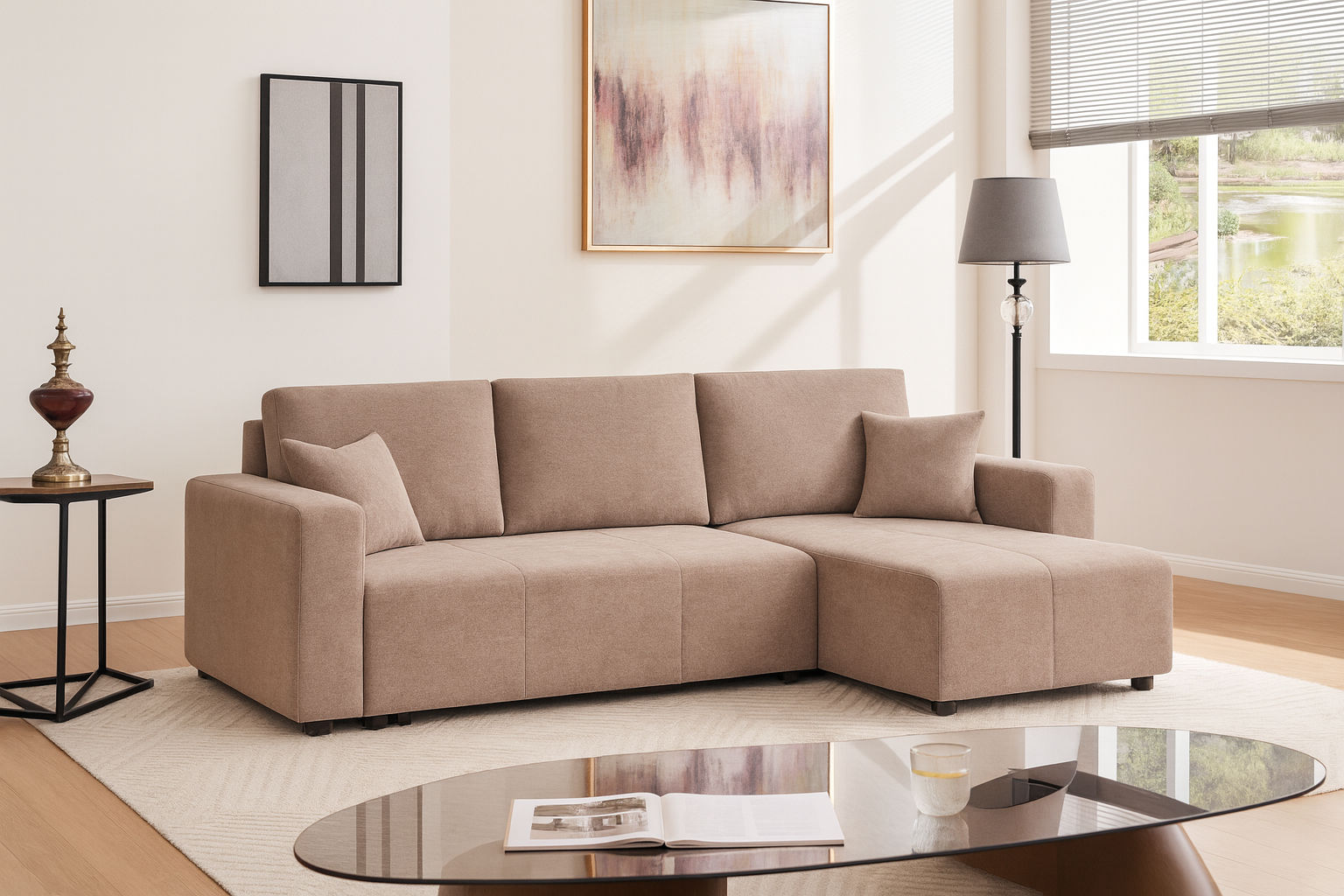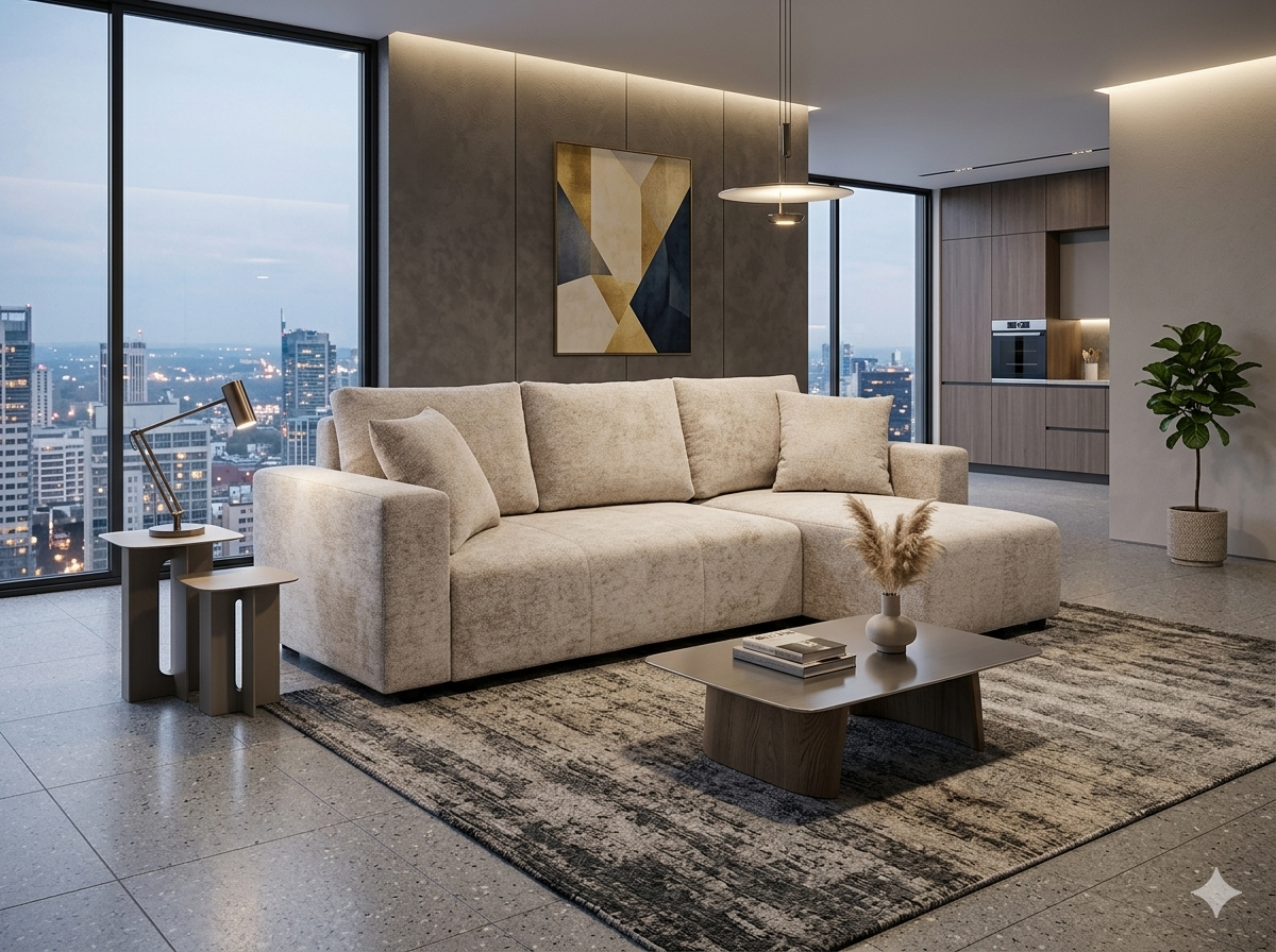 Ugaona garnitura NURIA u toploj bež boji predstavlja savršen spoj modernog dizajna, udobnosti i praktičnosti. Svojim jednostavnim, ali sofisticiranim izgledom lako se uklapa u različite stilove enterijera – od modernih i minimalističkih, do klasičnih i porodičnih prostora.