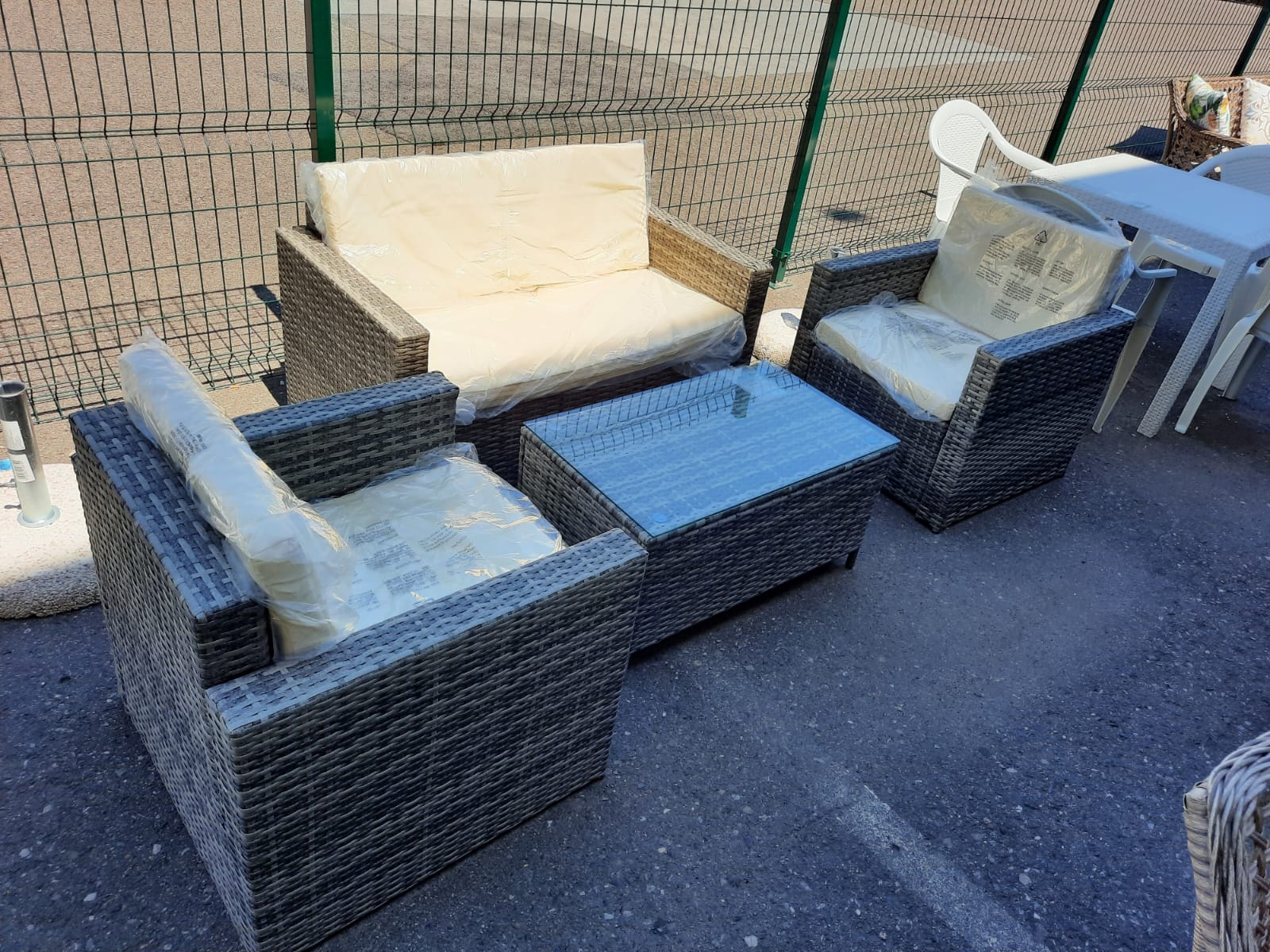 U setu dolazi: dvosjed, 2x fotelja, stol sa prozirnim staklom, jastuci
